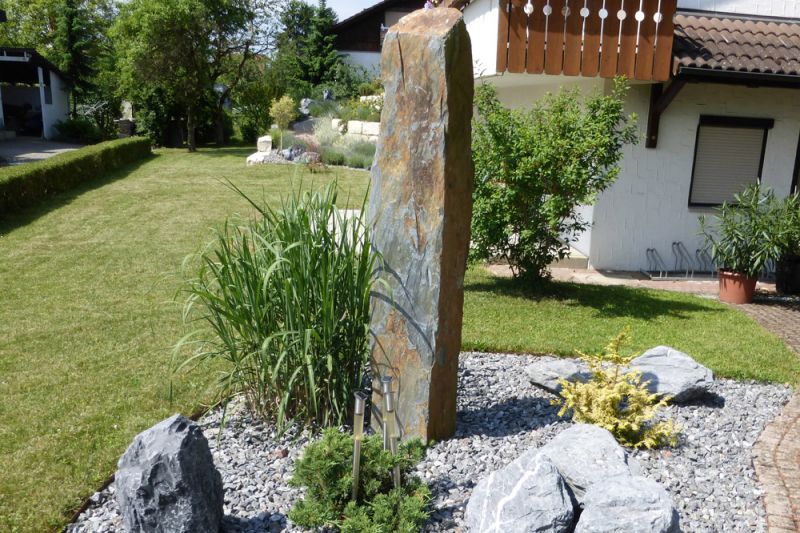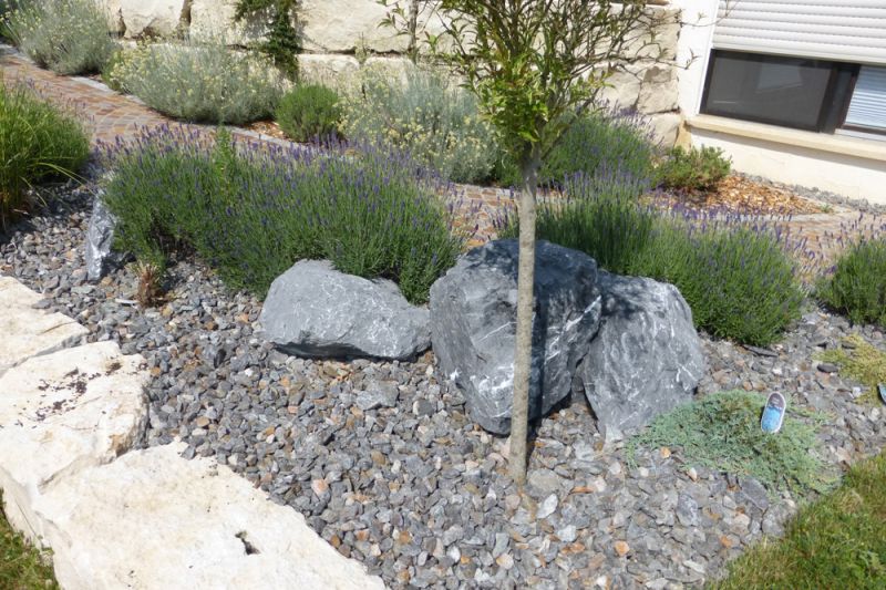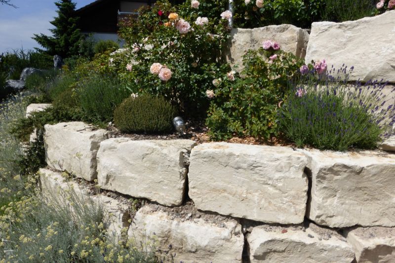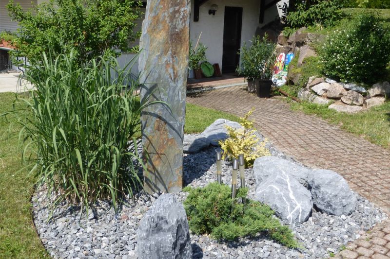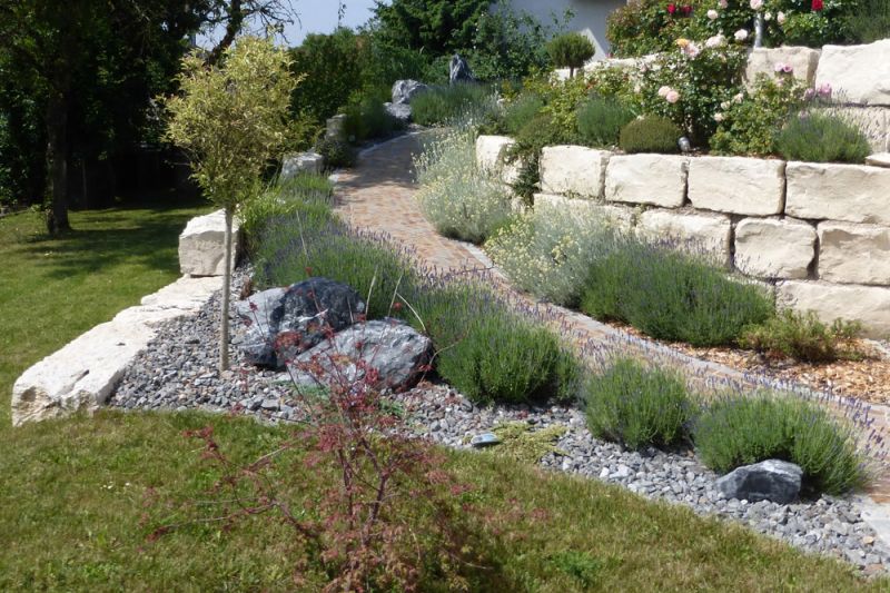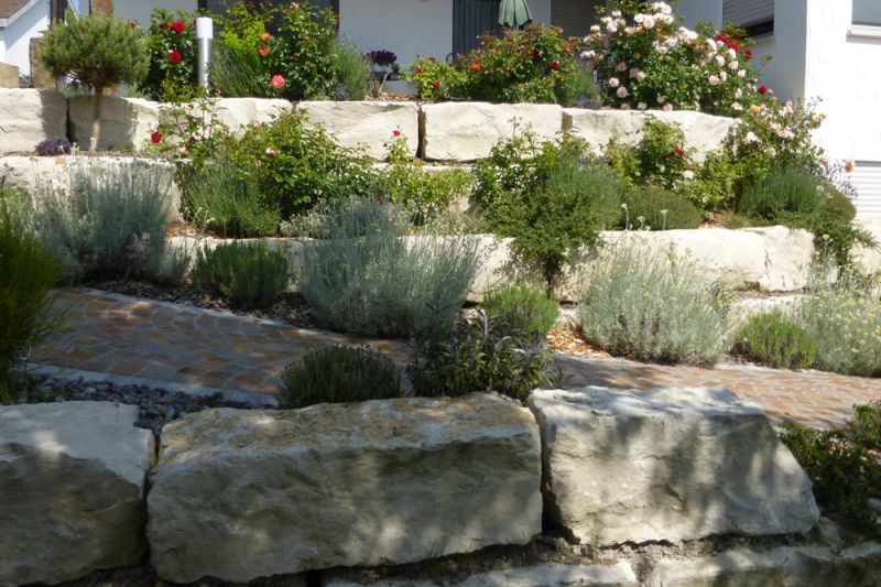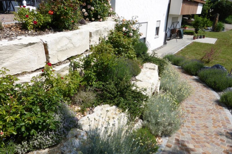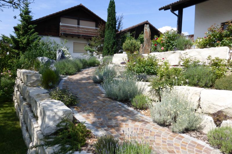 mit Pflasterweg und Natursteinmauer